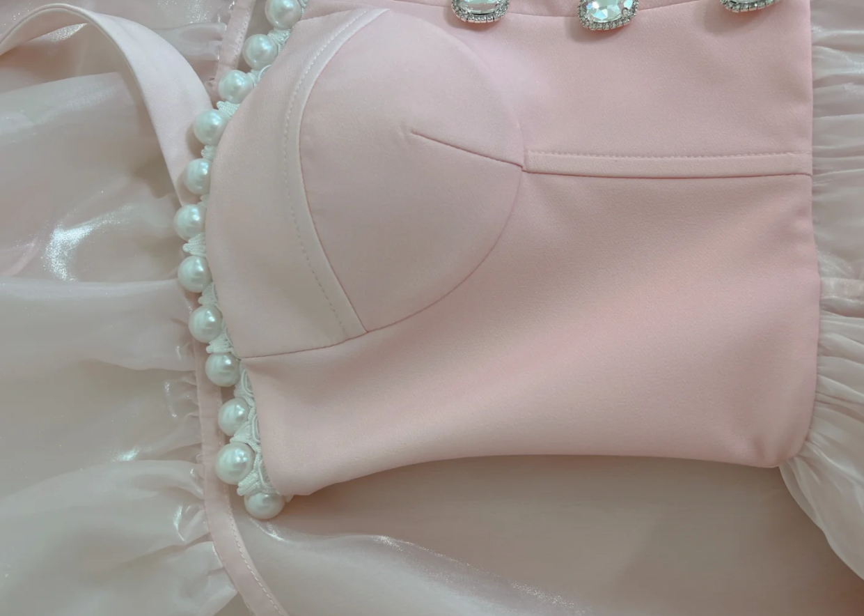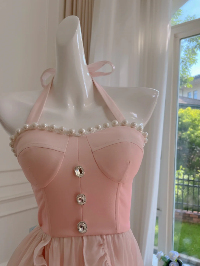 Simple Halter Pink Tulle Pearls Beaded High-Low Ruffles Homecoming Dress Party Dress Y8582