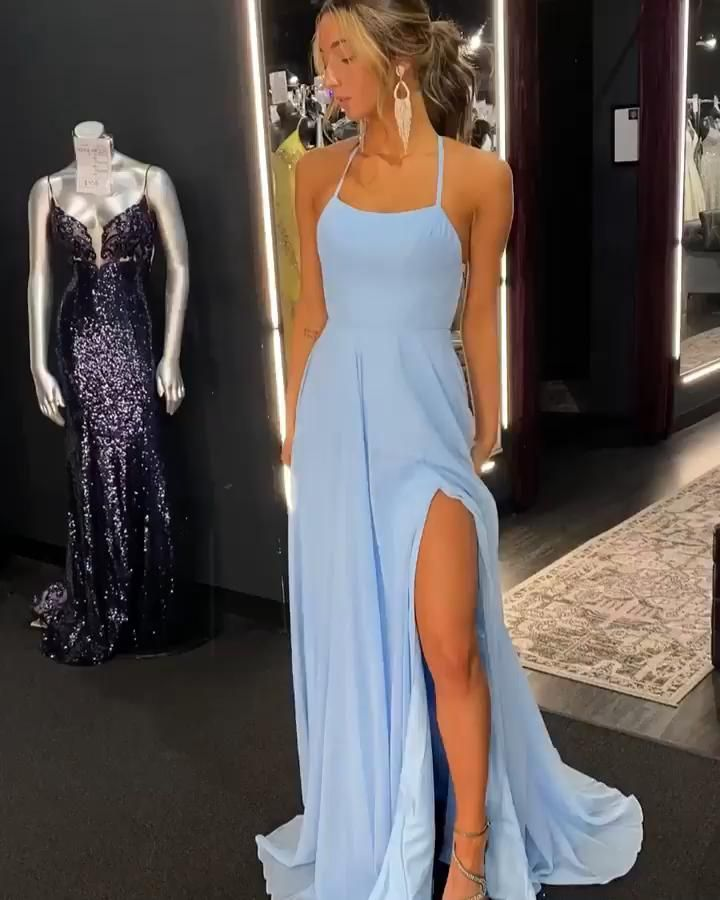 Sky blue chiffon prom dresses halter sheath long evening party dress Y7045