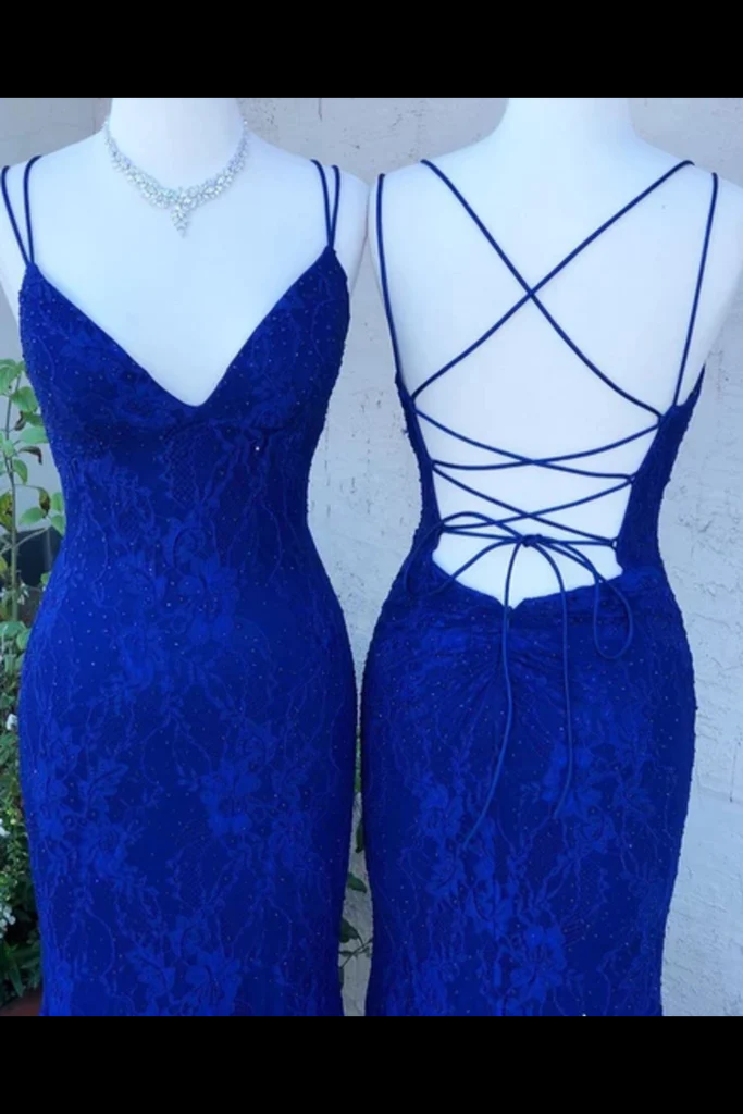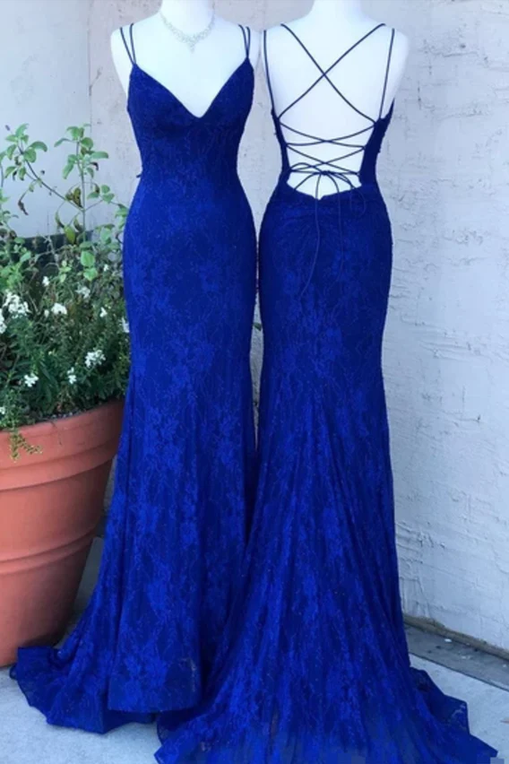 Spaghetti Crossed Straps Royal Blue Mermaid Prom Dresses V Neck Lace Formal Dresses Y1192