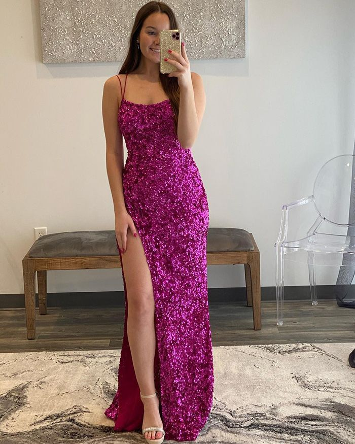 Spaghetti Straps Rose Red Sequin Mermaid Prom Dress with Side Slit Y6319