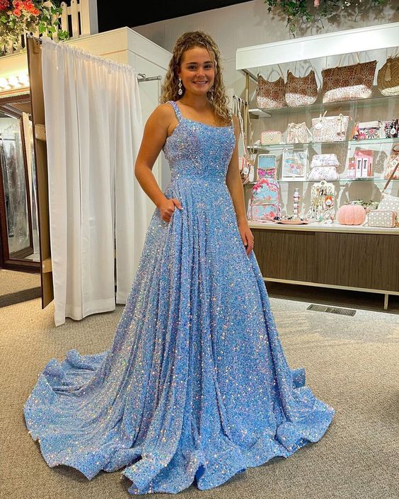 Sparkly A Line Square Neck Blue Sequins Long Prom Dresses With Pockets Y348