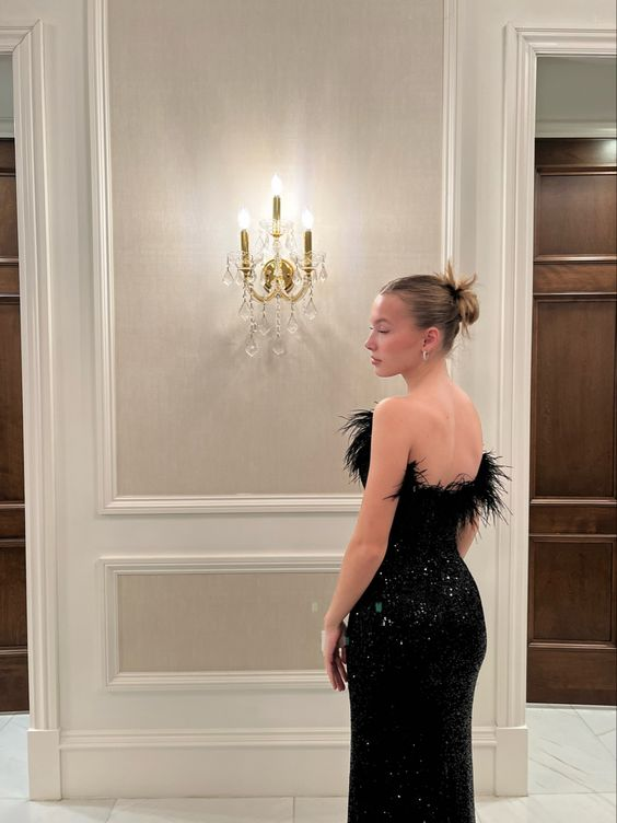 Sparkly Black Sheath Strapless Long Sequin Prom Dress with Feathers Y6195