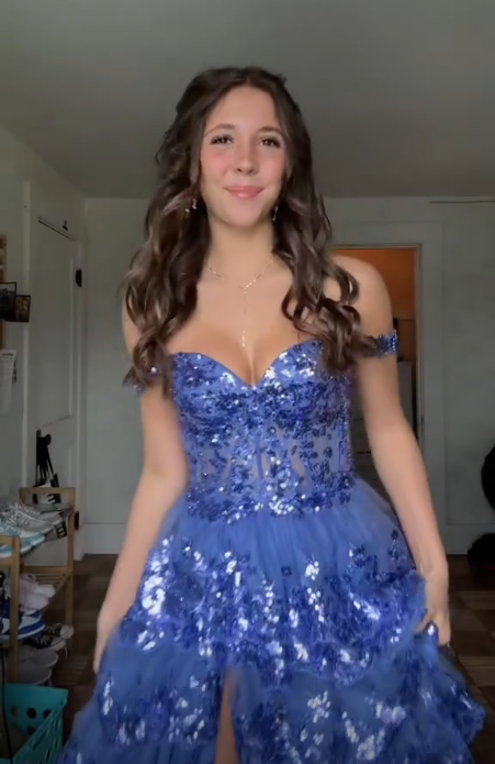 Sparkly Blue Tulle Sequins Layered Evening Dress Formal Slit Prom Dress Y7961