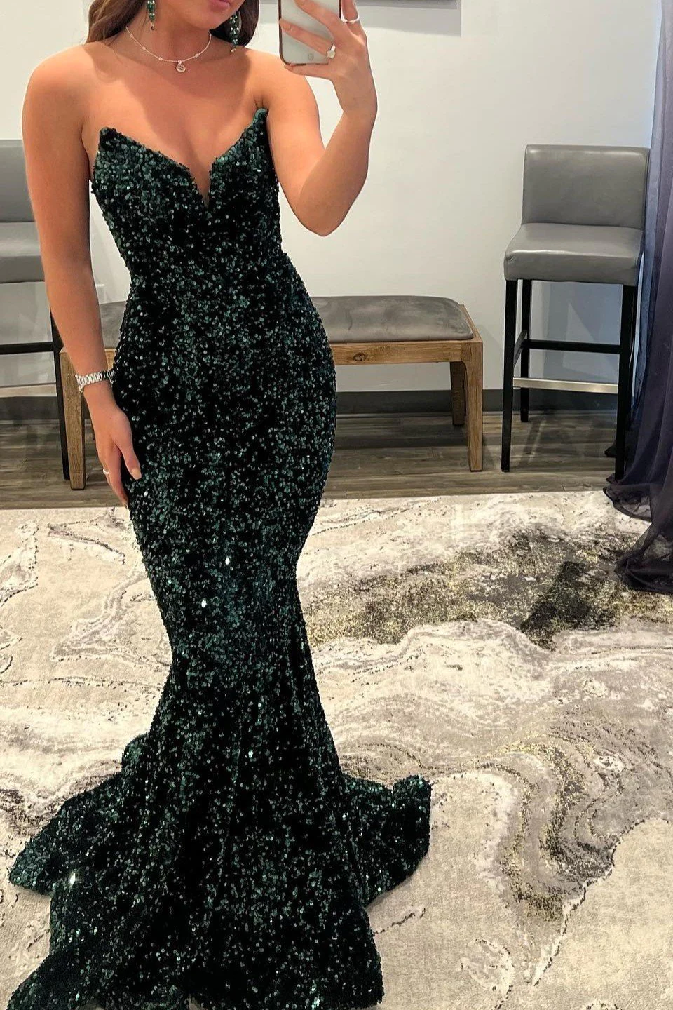 Sparkly Mermaid Strapless Dark Green Sequins Long Prom Dresses Y1494