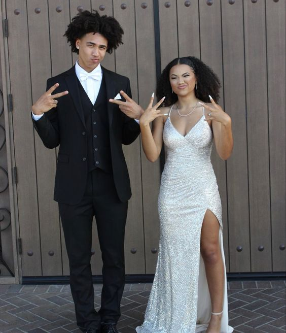 Sparkly Mermaid V Neck White Sequins Long Prom Dress With Slit Y6510
