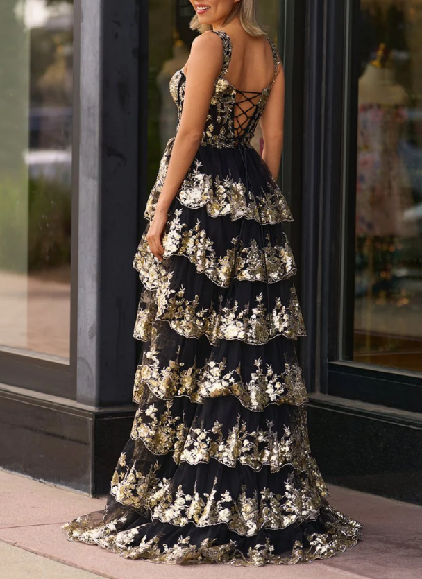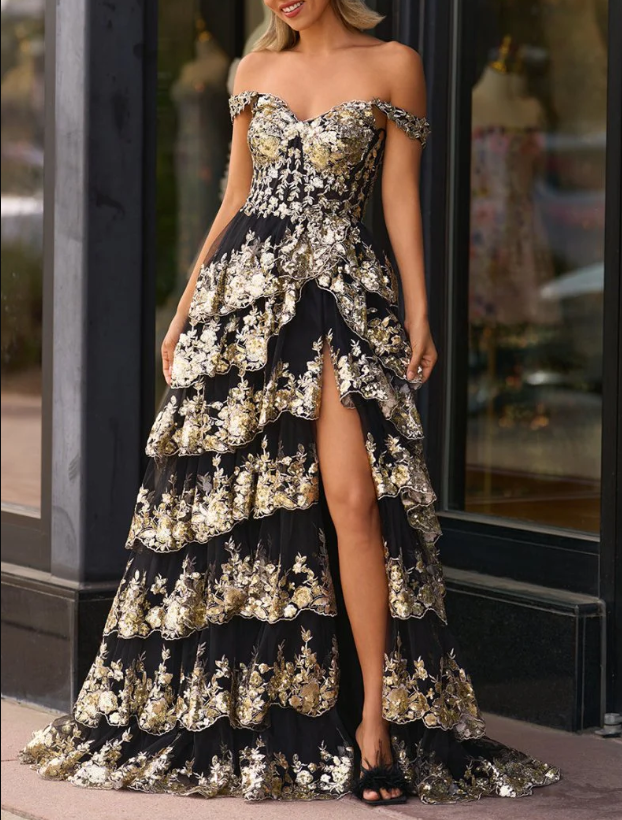 Sparkly Off The Shoulder Black Tulle Appliques Slit Prom Dress,Layered Long Prom Dress Y8428