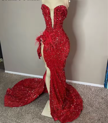 Sparkly Sequined Red Sweetheart Long Prom Dress For Black Girls Feathers Birthday Party Gowns High Slit Evening Gown Y6599