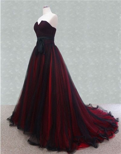 Strapless Black and Red Tulle Sweep Train Prom Dress Y1155