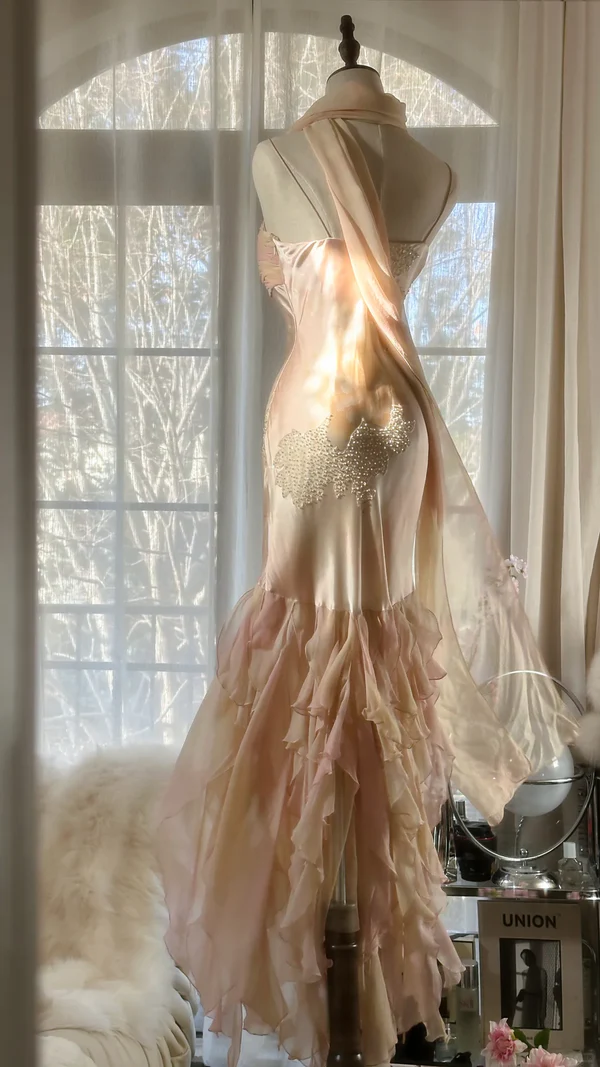Sweet Mermaid Beaded Ruffles Long Prom Dress,Spaghetti Straps Chiffon Evening Dress Y8757