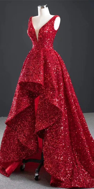 V-neck Long A-line Hi-low Red Sequin Prom Dresses, Long Prom Dresses Y763