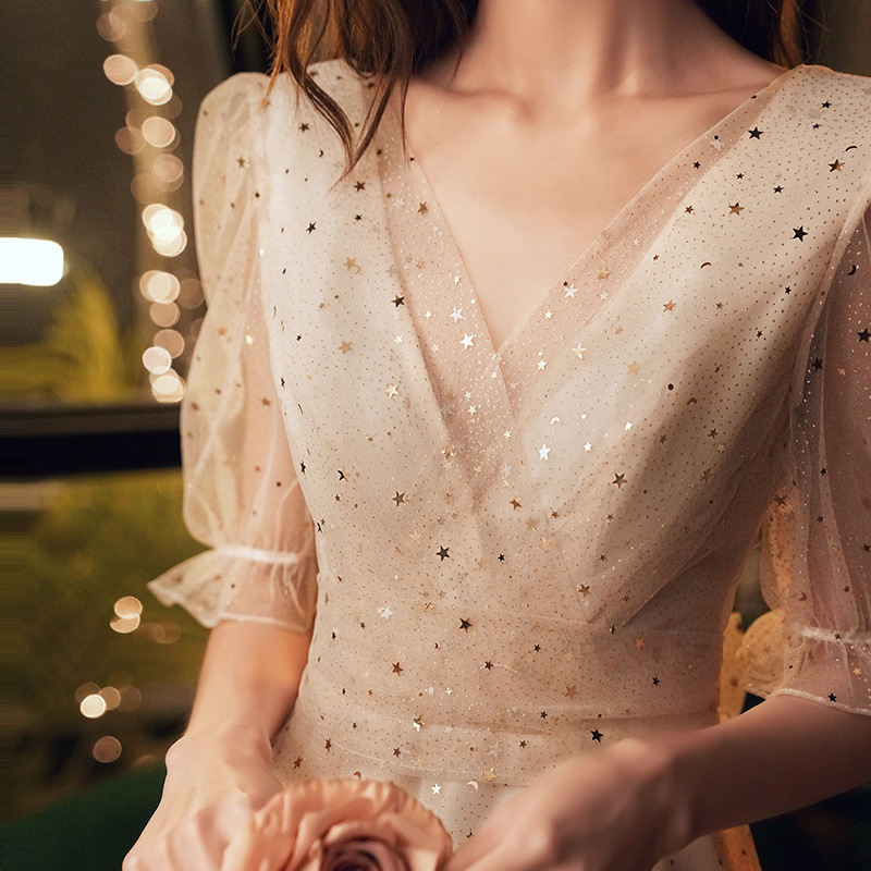V-neck Party Dress,short Sleeve Prom Dress,shiny Graduation Dress Y5799