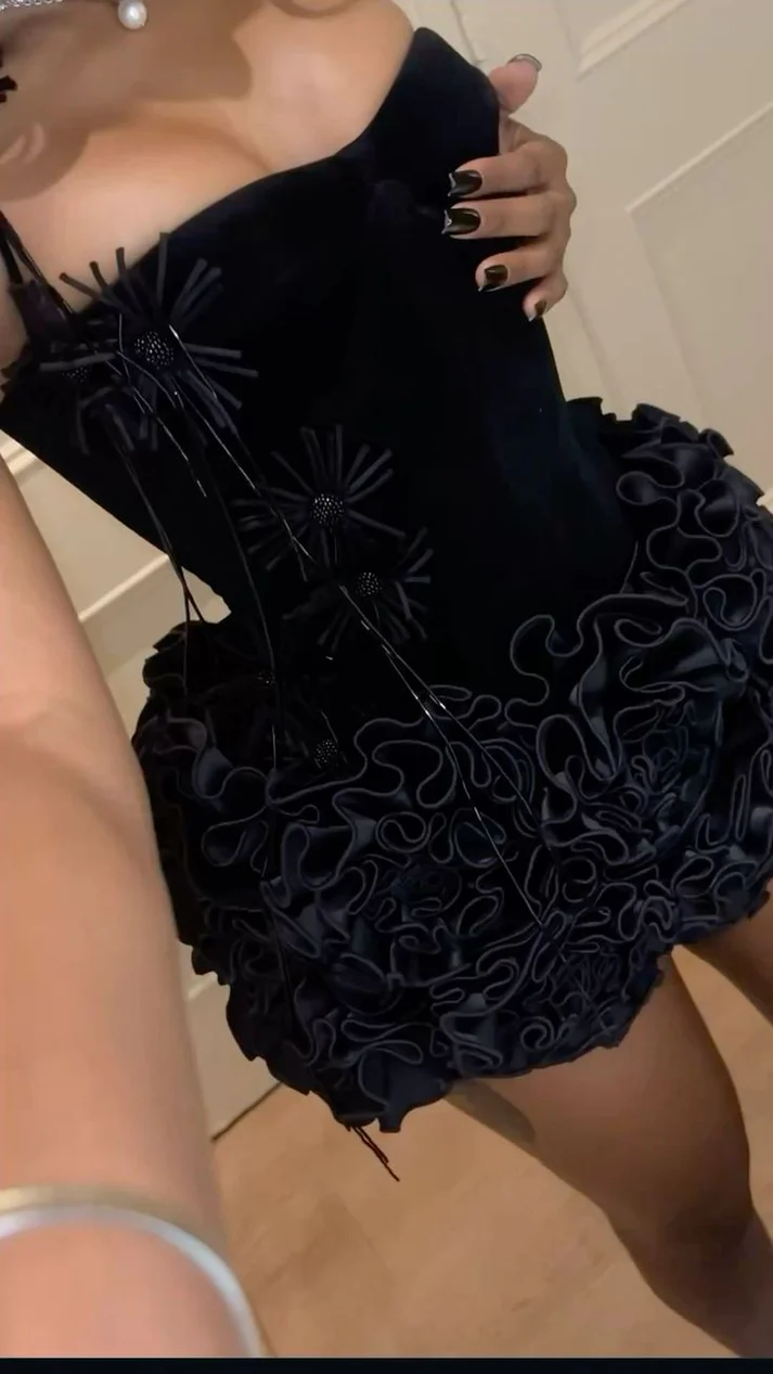 Vintage Black Satin Rose Pleated Halter Cocktail Dress Short Birthday Dress Homecoming Dress Y9321