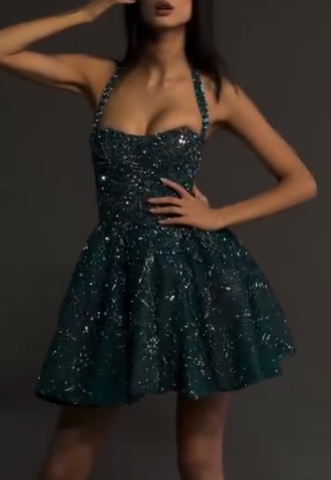 Vintage Halter Green Tulle Beaded ALine Formal Homecoming Dress Cocktail Dress Y9358