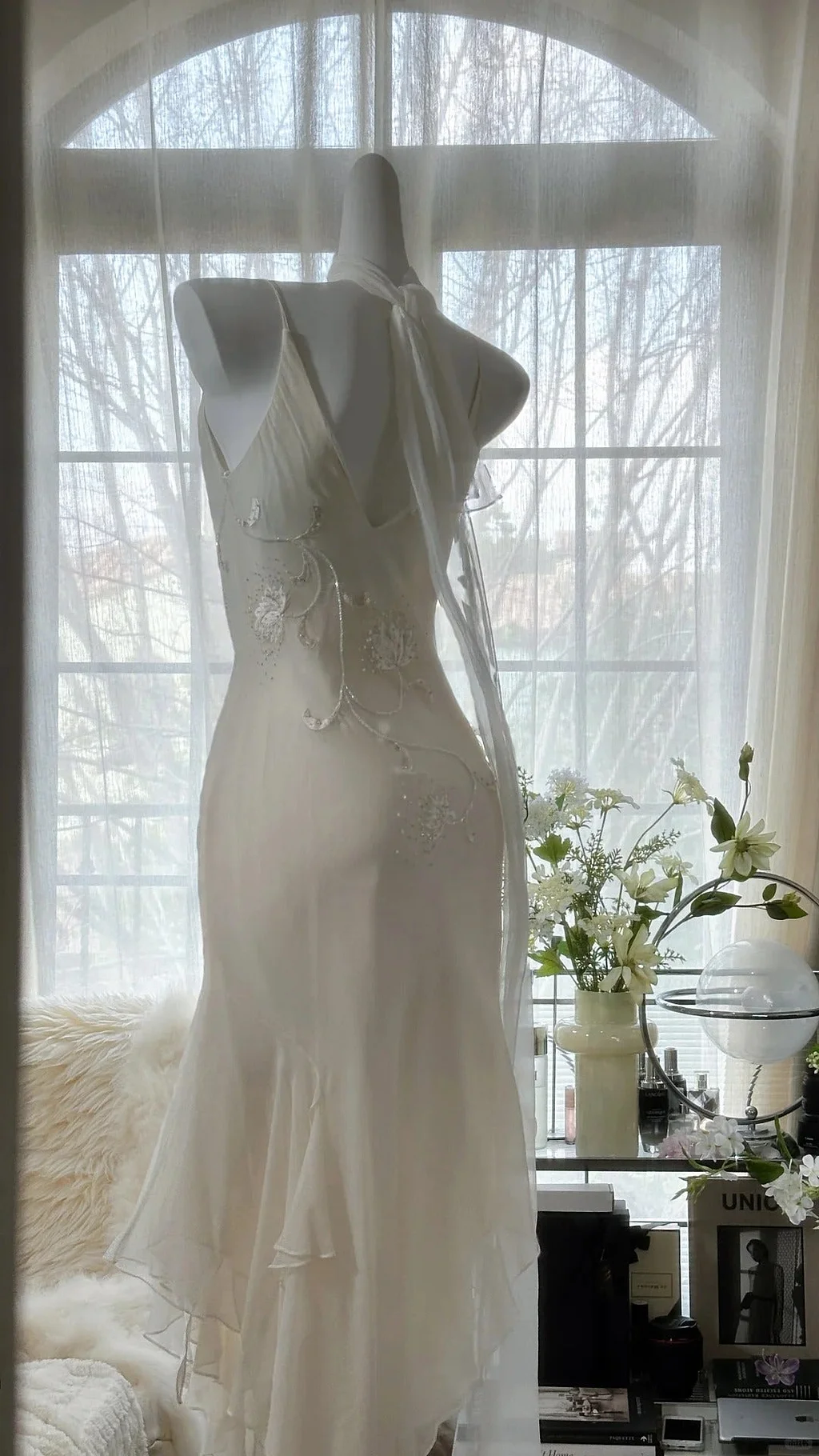 Vintage Ivory Chiffon Beaded Evening Dresses, Elegant Mermaid Party Gowns Y8698