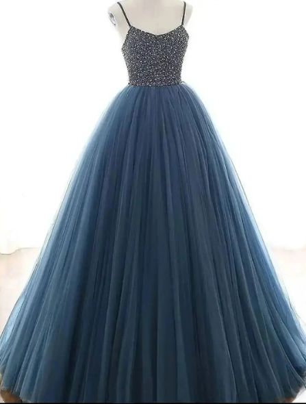Vintage Navy Blue Spaghetti Straps Tulle Beaded Long Evening Dress Prom Gown SP33