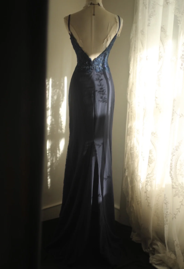 Vintage Spaghetti Straps Navy Blue Satin Appliques Mermaid Evening Dress Long Wedding Guest Dress SP1022