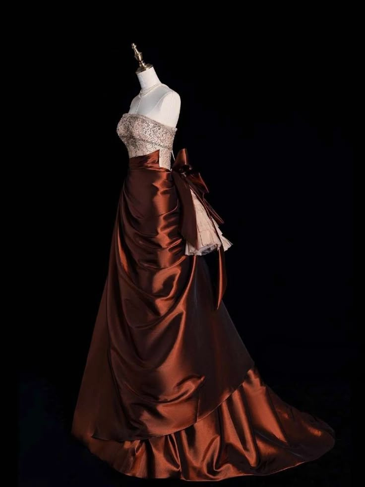 Vintage Strapless Satin Beaded A Line Evening Dress Prom Gown Y8795