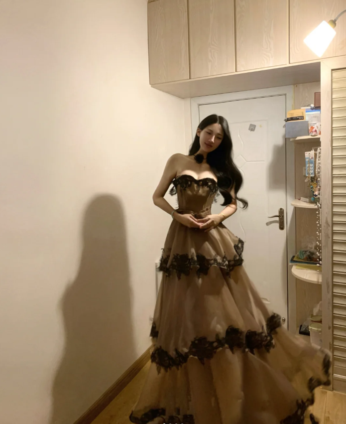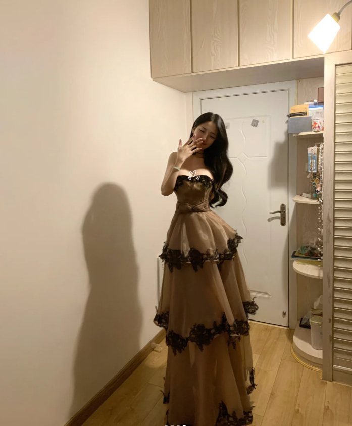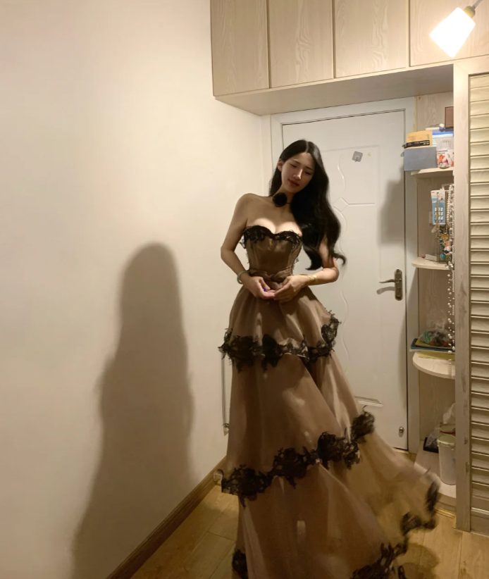 Vintage Strapless Tulle Appliques Layered A Line Long Party Dress Guest Dress SP295