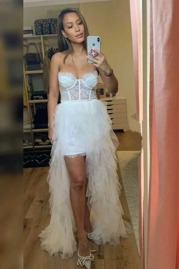 White High Low Sweetheart Tulle Prom Dress With Lace, Unique Formal Gown Y1110