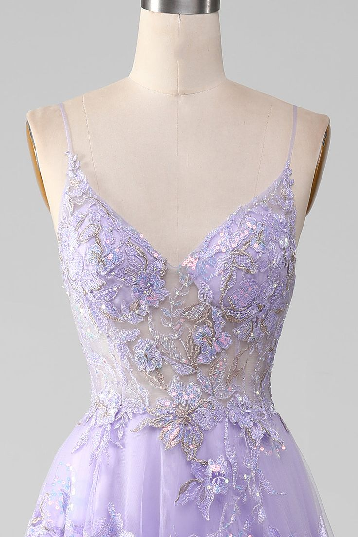 Women Sequins Purple Prom Dress with Embroidery A-Line Tulle Spaghetti Straps Party Dress Y7023