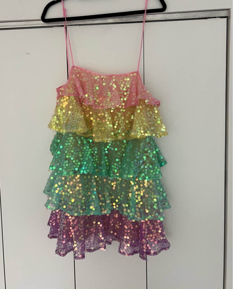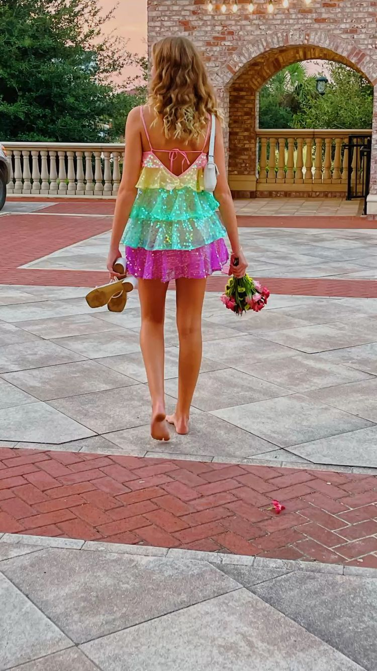 Women Shiny Sequin Sparkle Homecoming Dress Sleeveless Glitter Layered Rainbow Ruffle Dress Party Club Night Dress,Y2475