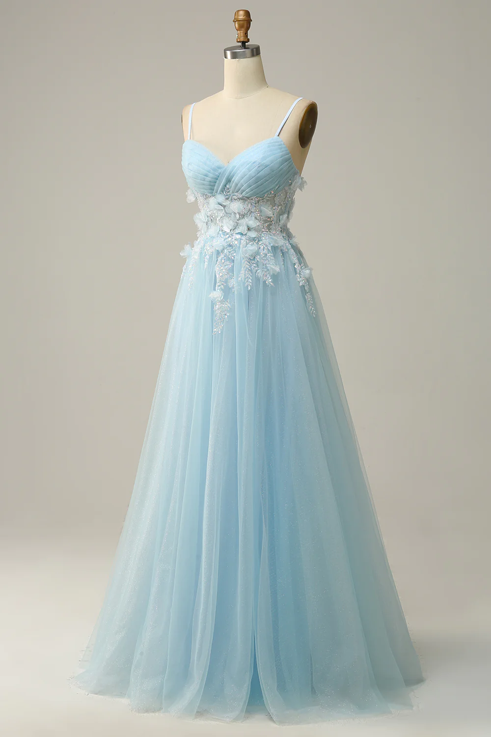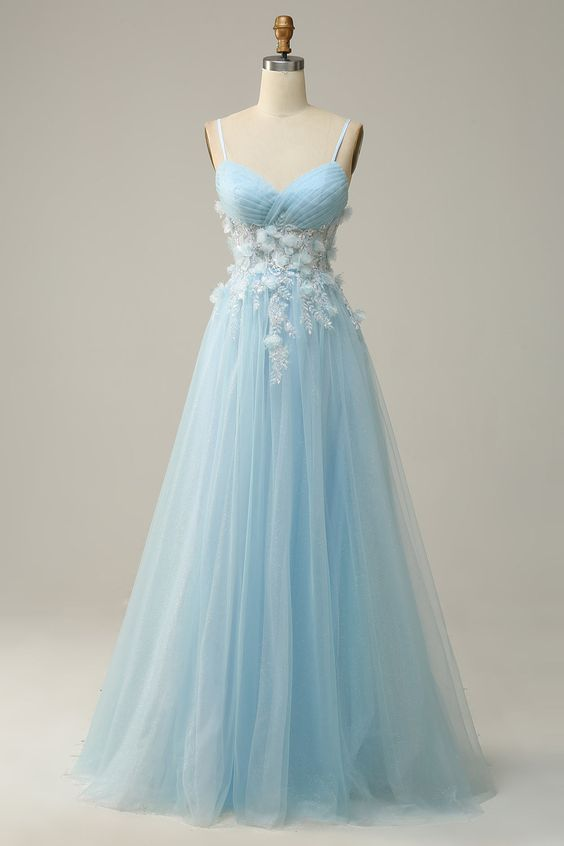 Women Sky Blue Spaghetti Straps A Line Tulle Long Prom Dress Y7032
