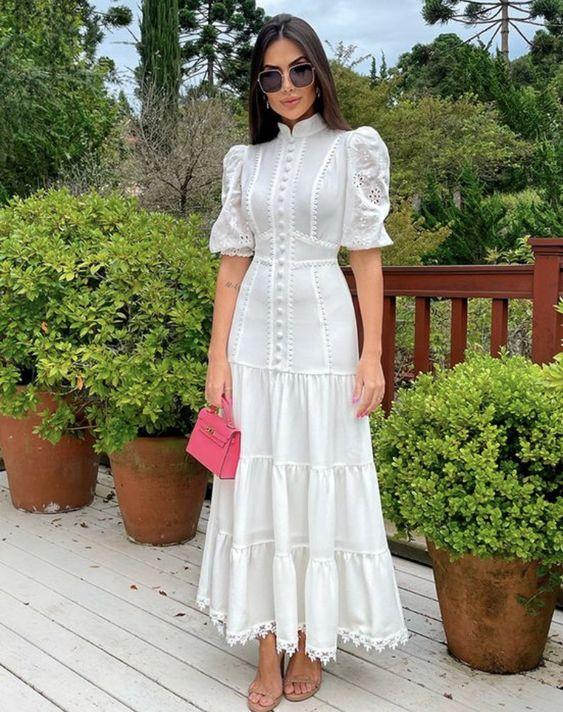 Women Stand Collar Short Puff Sleeve High Waist Patchwork Lace Long Dresses,White Prom Dress Y5478